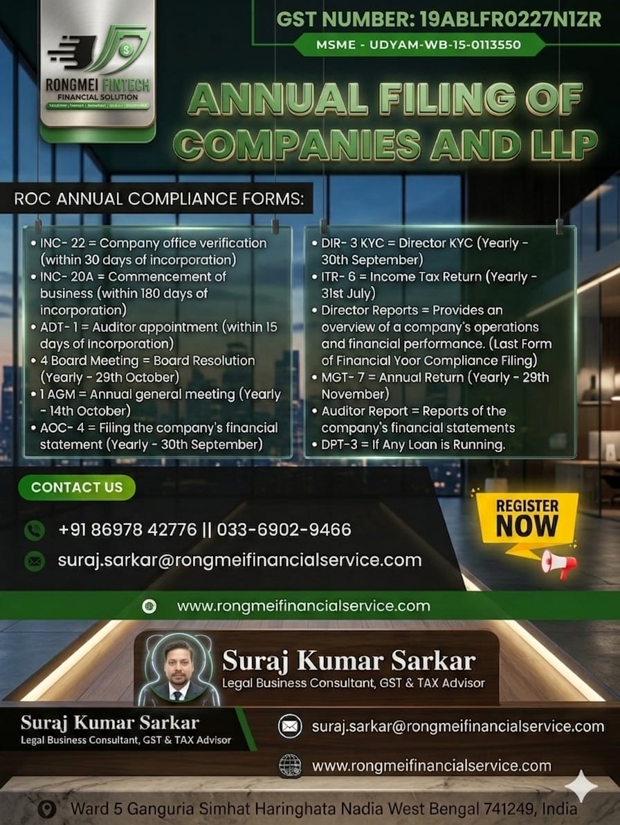 Registrar of Companies - ROC Compliance (ALREADY AUDITOR APPOINTMENT WITH US) ROC stands for the Registrar of Companies, which is a government office under the Ministry of Corporate Affairs (MCA). While "Registration of Compliances" is a common way to describe it, the official term is ROC Compliance—the mandatory legal requirement for every Company and LLP in India to file their financial and administrative data with the government every year. ROC - Annual Filing of Companies and LLP PVT. LTD. / OPC / LLP / TRUST / NGO /SOCIETY 1. What is the ROC? The ROC is the "watchdog" of the corporate world in India. Every State has its own ROC office (e.g., ROC Mumbai, ROC Delhi). Its job is to: Maintain a public record of all registered businesses. Ensure that companies are operating transparently. Monitor whether companies are holding meetings and paying debts 2. The "Must-File" Annual Compliances (2026) Every company, even those with zero turnover, must file these forms annually to avoid being "struck off" (shut down) by the government. FormPurposeKey Deadline (for FY 25-26)AOC-4Filing of Audited Financial Statements (Balance Sheet & P&L).30th October 2026MGT-7/7AAnnual Return (Details of Shareholders and Directors).29th November 2026DIR-3 KYCVerification of Director's details (Aadhaar/PAN/Phone/Email).30th September 2026DPT-3Return of Deposits (reporting any loans taken by the company).30th June 2026MSME-1Reporting outstanding payments to MSME vendors (>45 days).Half-Yearly (Apr & Oct) 3. Event-Based Compliances Unlike annual filings, these are "triggered" only when a specific change happens in your business: DIR-12: Filed within 30 days of appointing or removing a Director INC-22: Filed if you change your Registered Office address PAS-3: Filed if the company issues new shares to someone. SH-7: Filed if you increase your Authorized Share Capital. 4. Big Update: The CCFS-2026 Scheme If your company has missed previous filings, the government has just launched the Companies Compliance Facilitation Scheme (CCFS), 2026. Window: April 15, 2026, to July 15, 2026. Benefit: You can file old, pending returns by paying only 10% of the usual penalty. This is a rare "clean-up" opportunity to avoid director disqualification. Section 8 Company - ROC For an NGO registered as a Section 8 Company, ROC (Registrar of Companies) compliance is mandatory to maintain its "Active" status and tax-exempt benefits. Unlike a Trust or Society, a Section 8 Company must follow the strict digital filing ecosystem of the Ministry of Corporate Affairs (MCA). 1. Mandatory Annual ROC Forms These must be filed every year, regardless of whether the NGO had any activity or donations. FormPurposeDeadline (FY 2025-26)AOC-4Filing of Audited Financial Statements (Balance Sheet, P&L, Auditor's Report, and Director's Report).Within 30 days of AGM (Approx. Oct 30)MGT-7Annual Return containing details of directors, members, and any changes in the board during the year.Within 60 days of AGM (Approx. Nov 29)DIR-3 KYCVerification of Director’s details. Every person with a DIN must verify their phone and email via OTP.30th September 2026ADT-1Intimation of Auditor Appointment. Usually filed once every 5 years, unless the auditor is changed.Within 15 days of AGMDPT-3Return of Deposits. Used to report any loans or money received that aren't considered "deposits."30th June 2026 2. Key NGO-Specific Relaxations Section 8 Companies enjoy a few "perks" compared to regular Private Limited companies: Board Meetings: You only need to hold one meeting every 6 months, whereas private companies must hold four per year. Notice Period: General Meetings can be called with just 14 days' notice (instead of 21 days). Stamp Duty: Usually exempted or highly subsidized on the Memorandum and Articles of Association. Warning: If an NGO fails to file AOC-4 or MGT-7 for two consecutive years, the ROC can cancel its Section 8 License and "Strike Off" the company. Once the license is cancelled, all tax exemptions (12A/80G) are automatically at risk.