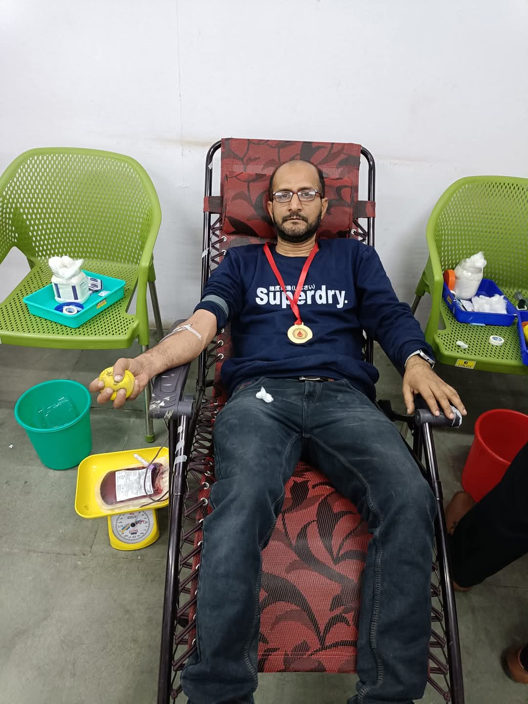 A volunteer donates blood at a camp organized to support lifesaving medical needs and promote community health.